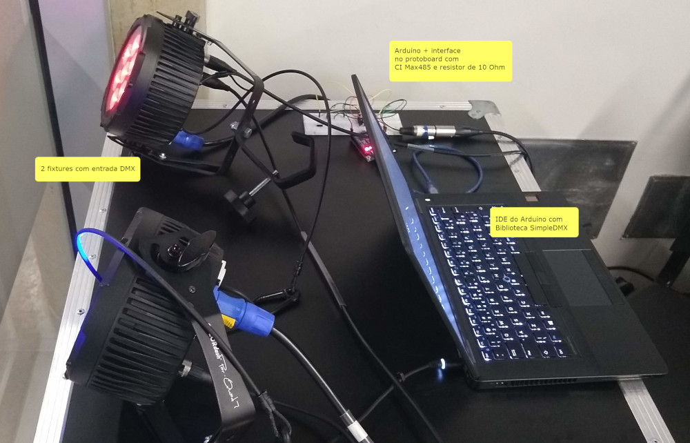 Estou começando a fazer um controlador de luzes com Arduíno. Primeiro construí um shield usando um circuito integrado MAX485 de acordo com este site. Mas estou usando outra biblioteca para acessar os canais. Usei a SimpleDMX e o seguinte código: