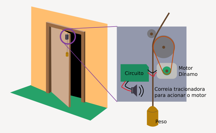 O circuito tem que ter um limitador da tensão que vem do dínamo. Pode acionar um microcontrolador com uma musiquinha complexa. Seria legal um amplificador para um alto-falante de 0,5W. O peso pode ser revestido de borracha para não marcar a porta. Dá para adaptar este dispositivo para gavetas.